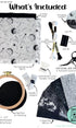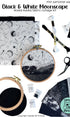 This is a beginner-friendly, fabric collage landscape embroidery kit. It includes all materials needed (EXCEPT SCISSORS) to create a monochrome moonscape like the one pictured here: