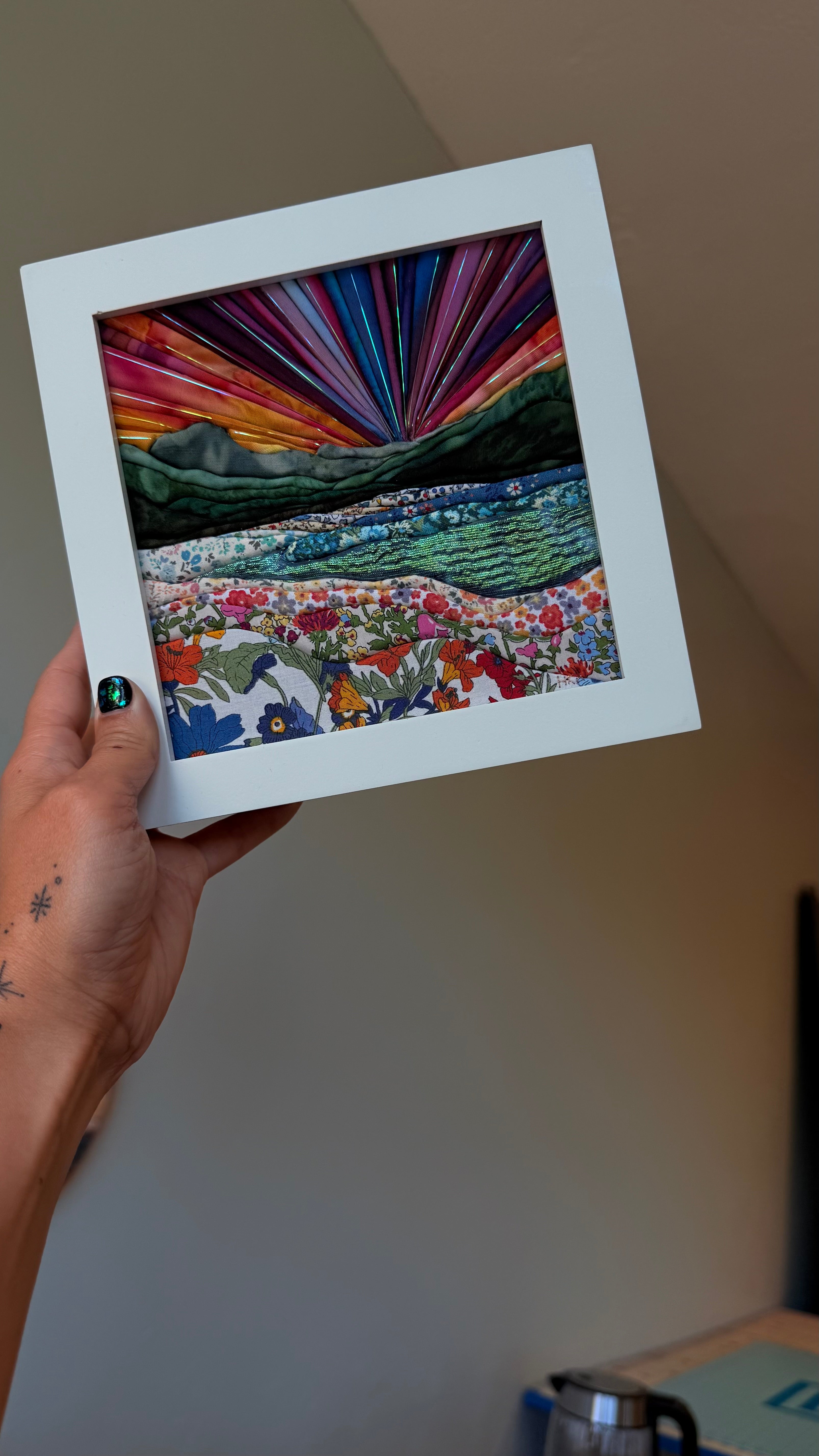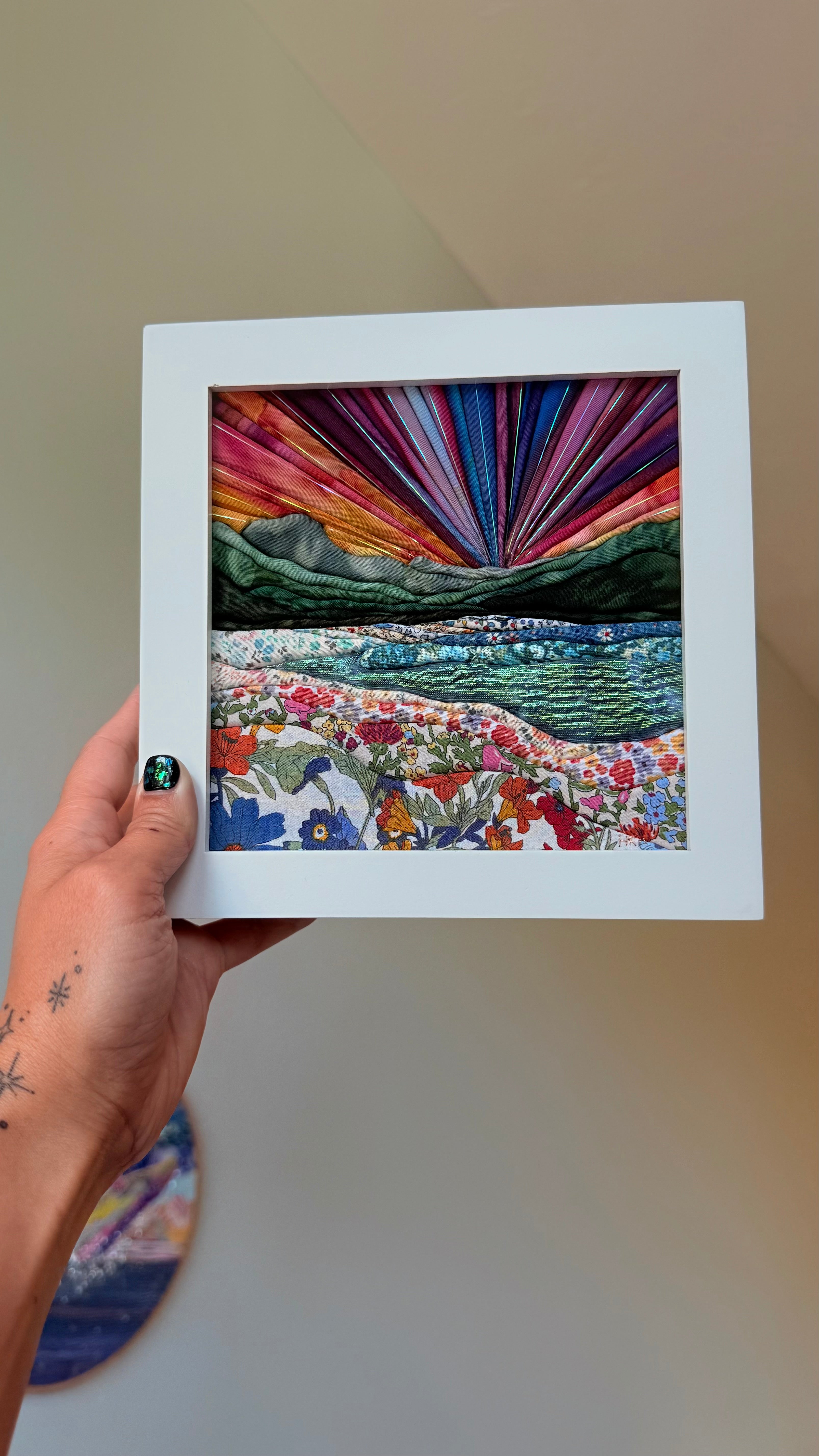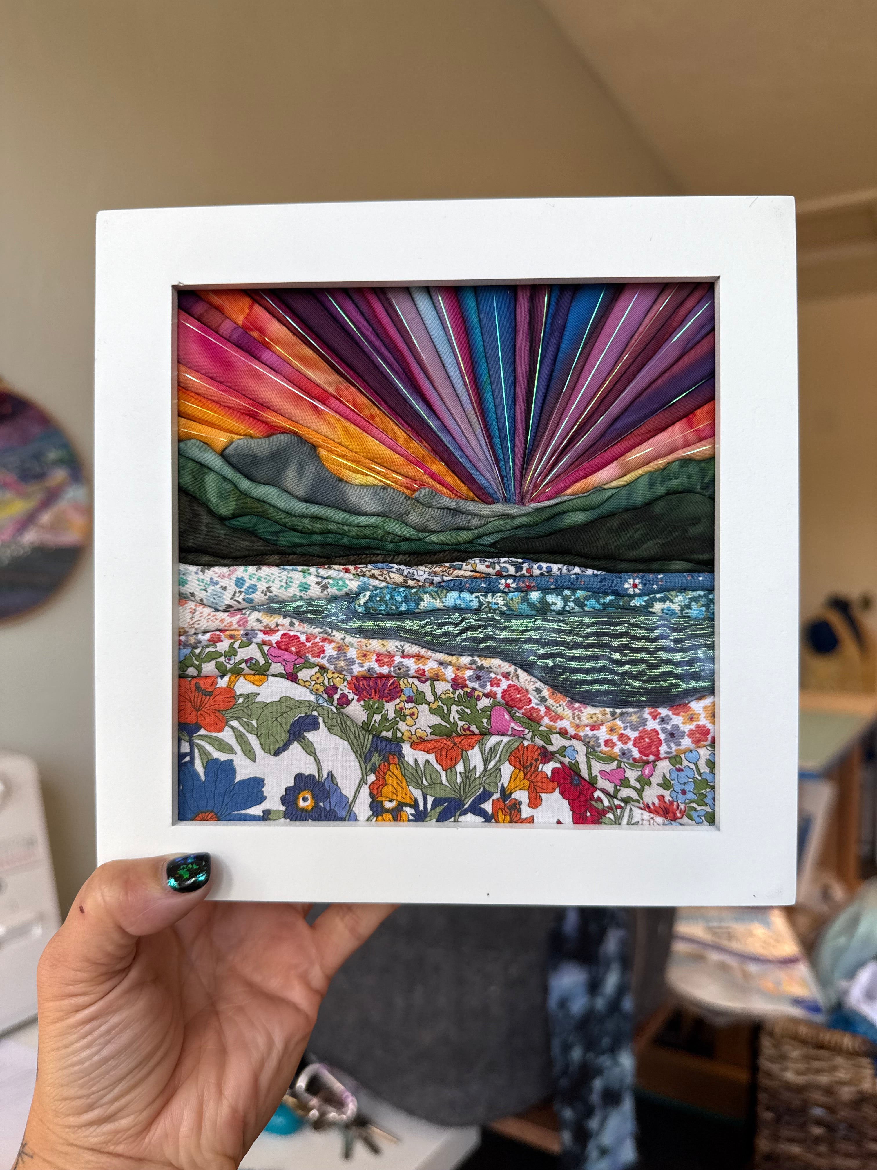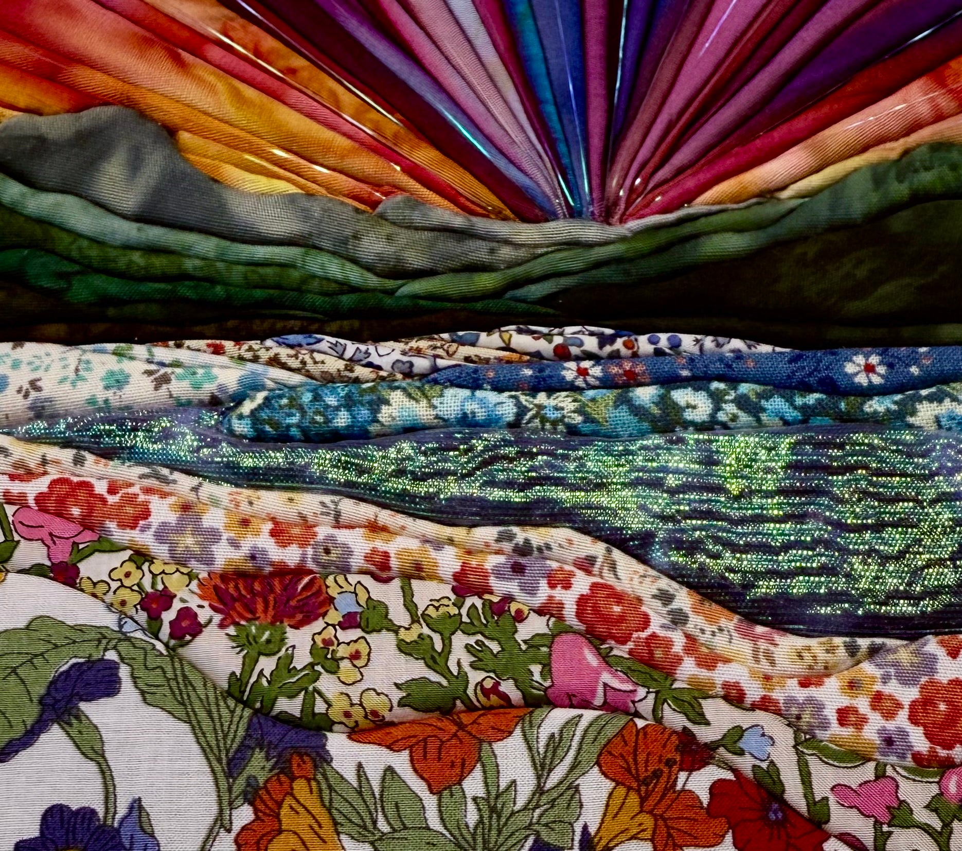 -hand cut landscape made of various fabrics including organza, cotton, and batiks.