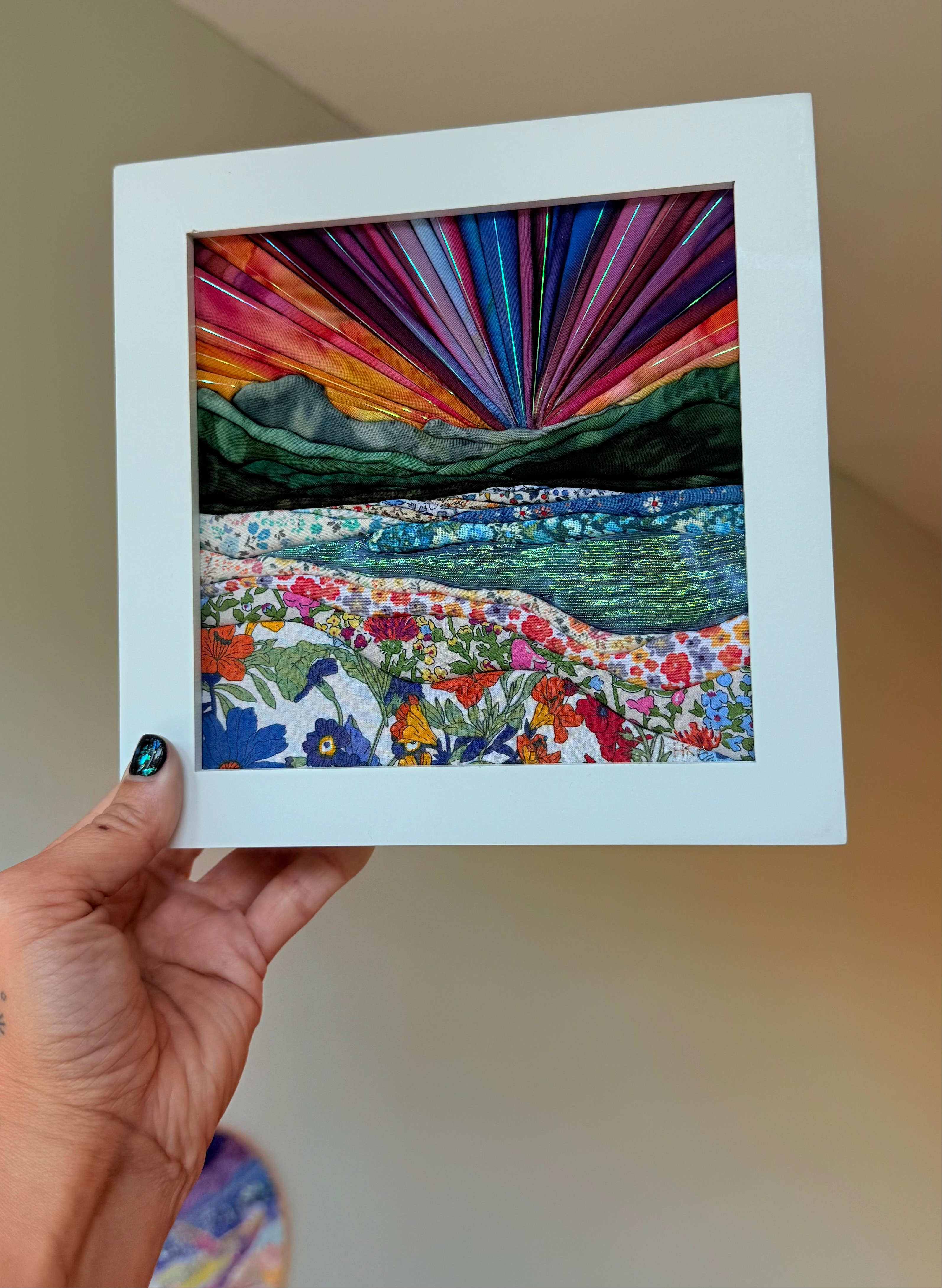 This is a handcrafted, one-of-a-kind framed kinusaiga fabric collage inspired by the landscapes of Oregon and beyond.