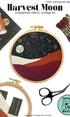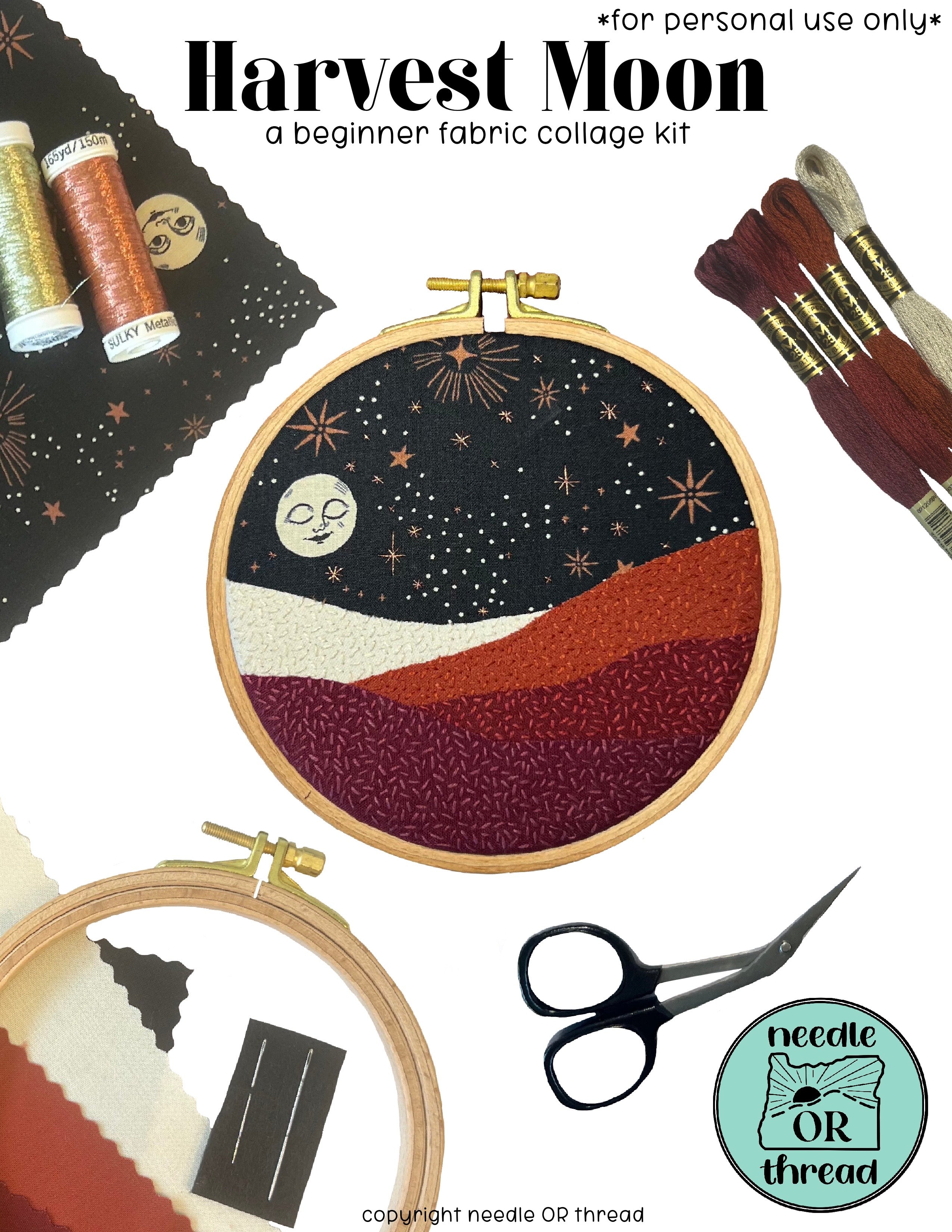 This is a beginner-friendly, fabric collage landscape embroidery kit. It includes all materials needed (EXCEPT SCISSORS) to create a boho moonscape like the one pictured here: