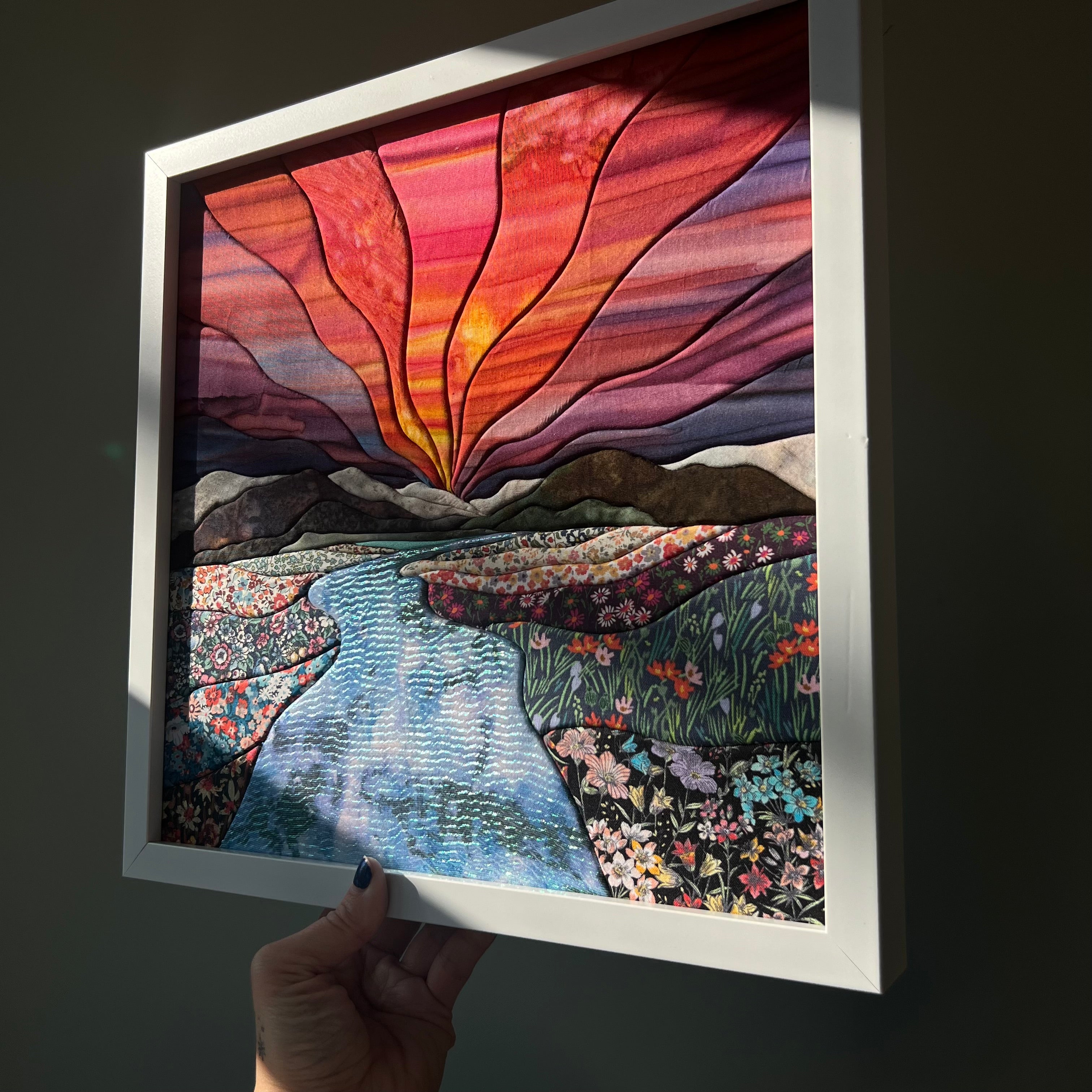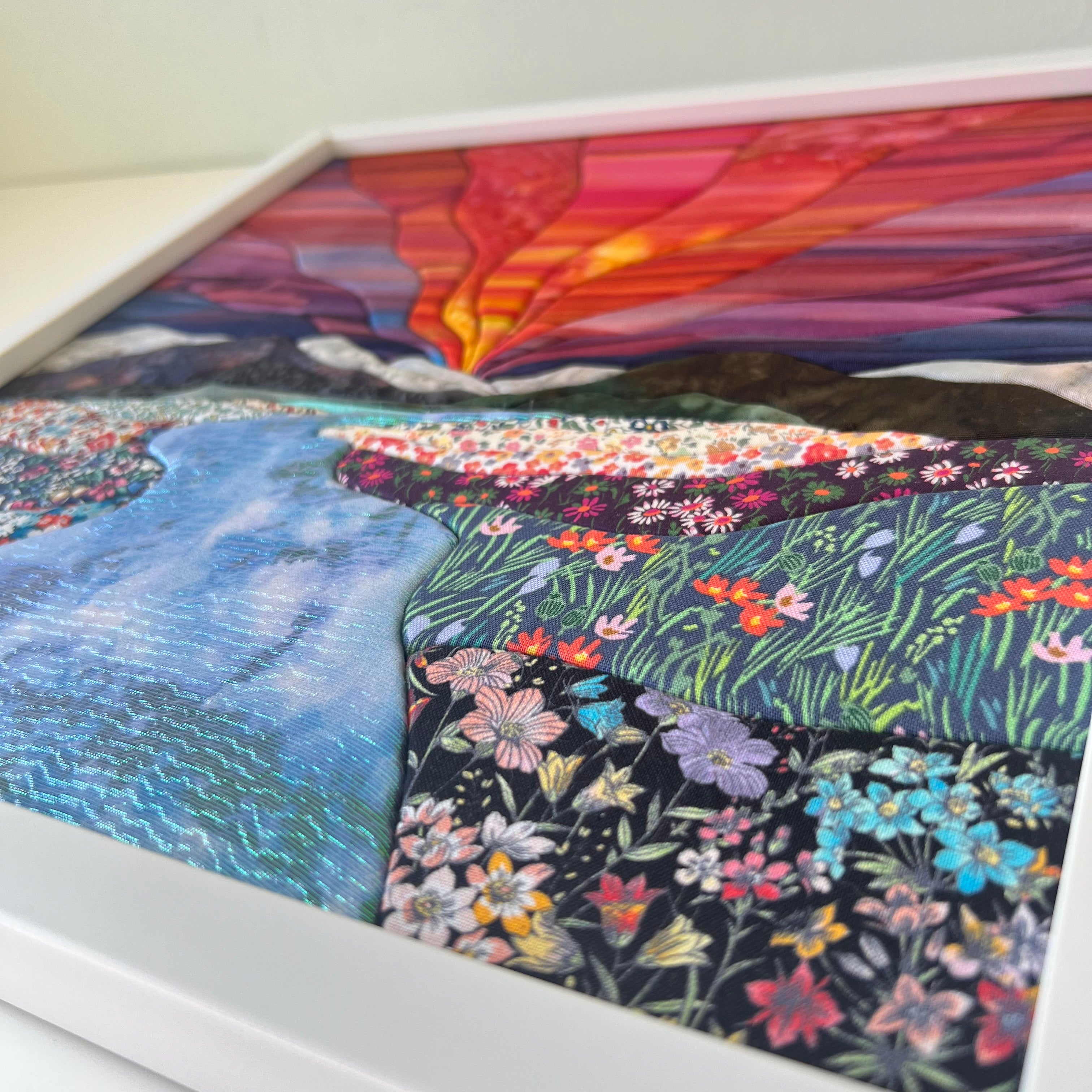 This is a handcrafted, one-of-a-kind framed kinusaiga fabric collage inspired by the landscapes of Oregon and beyond.