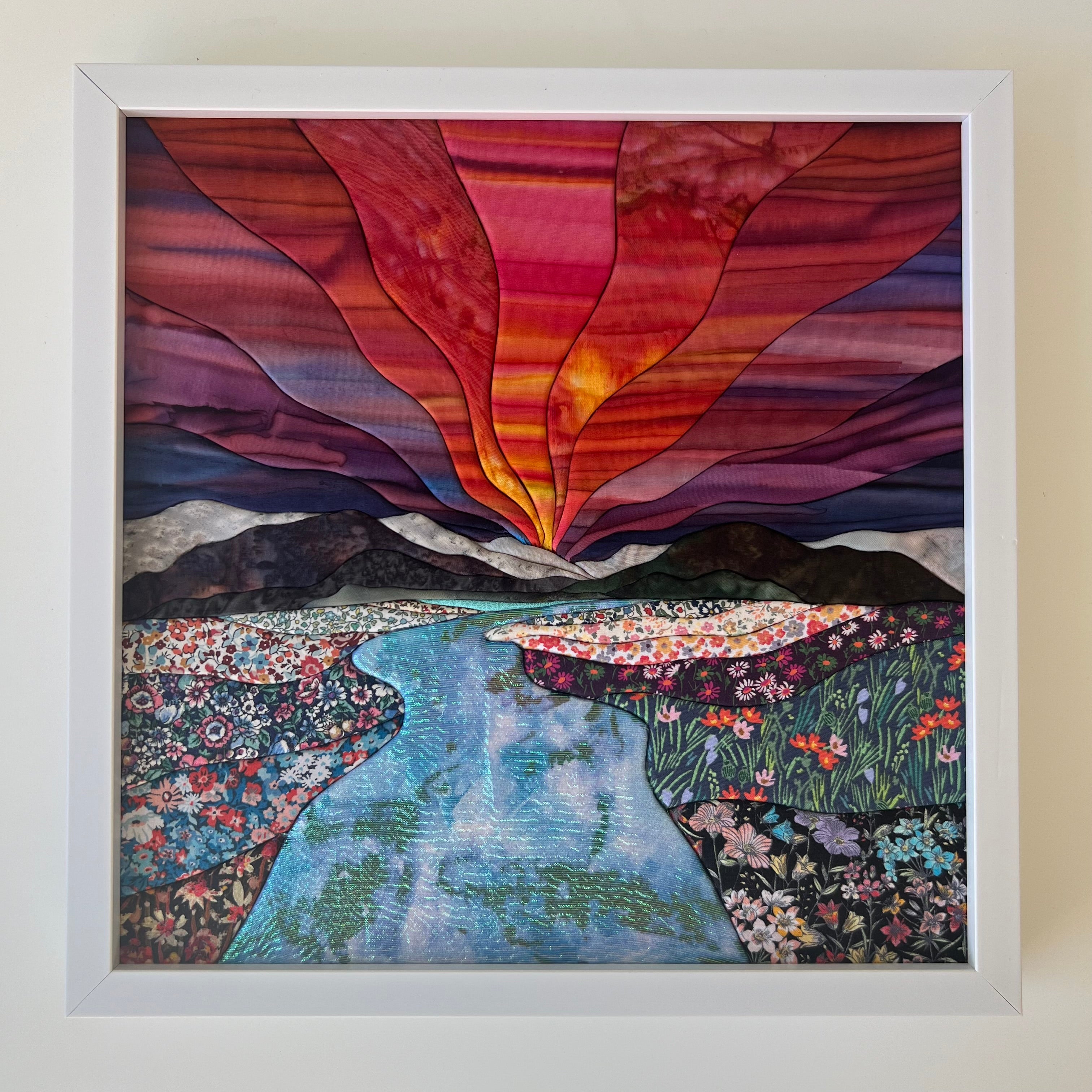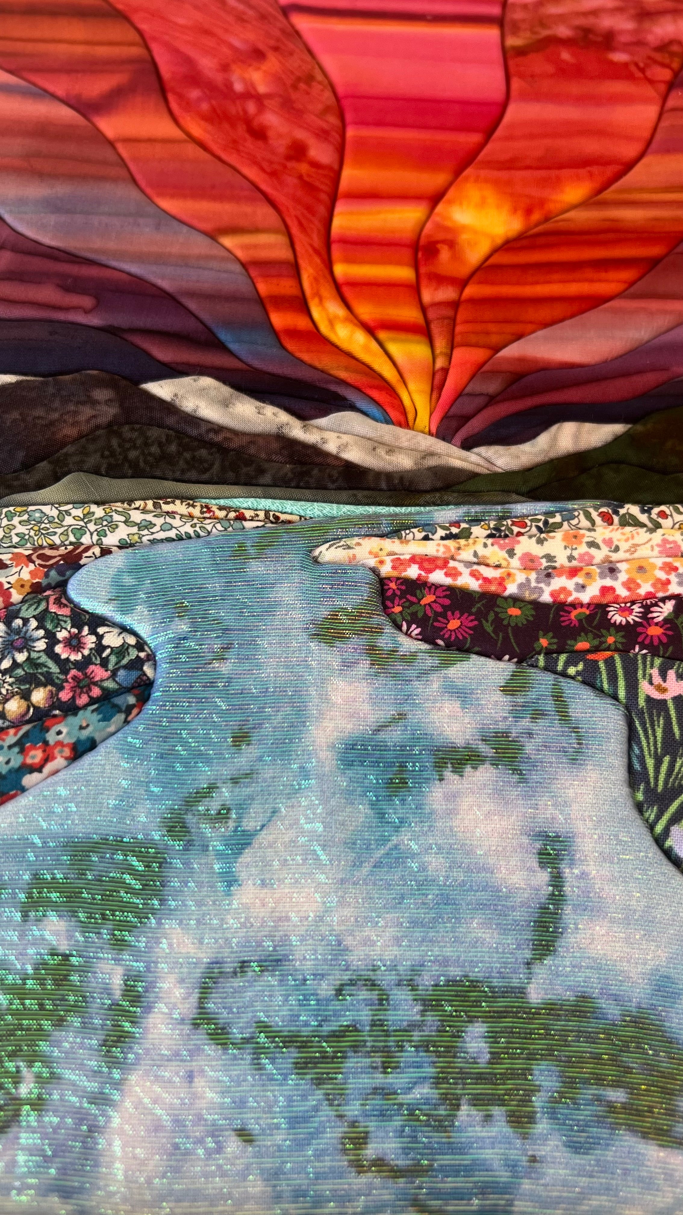 -hand cut landscape made of various fabrics including organza, cotton, and batiks.