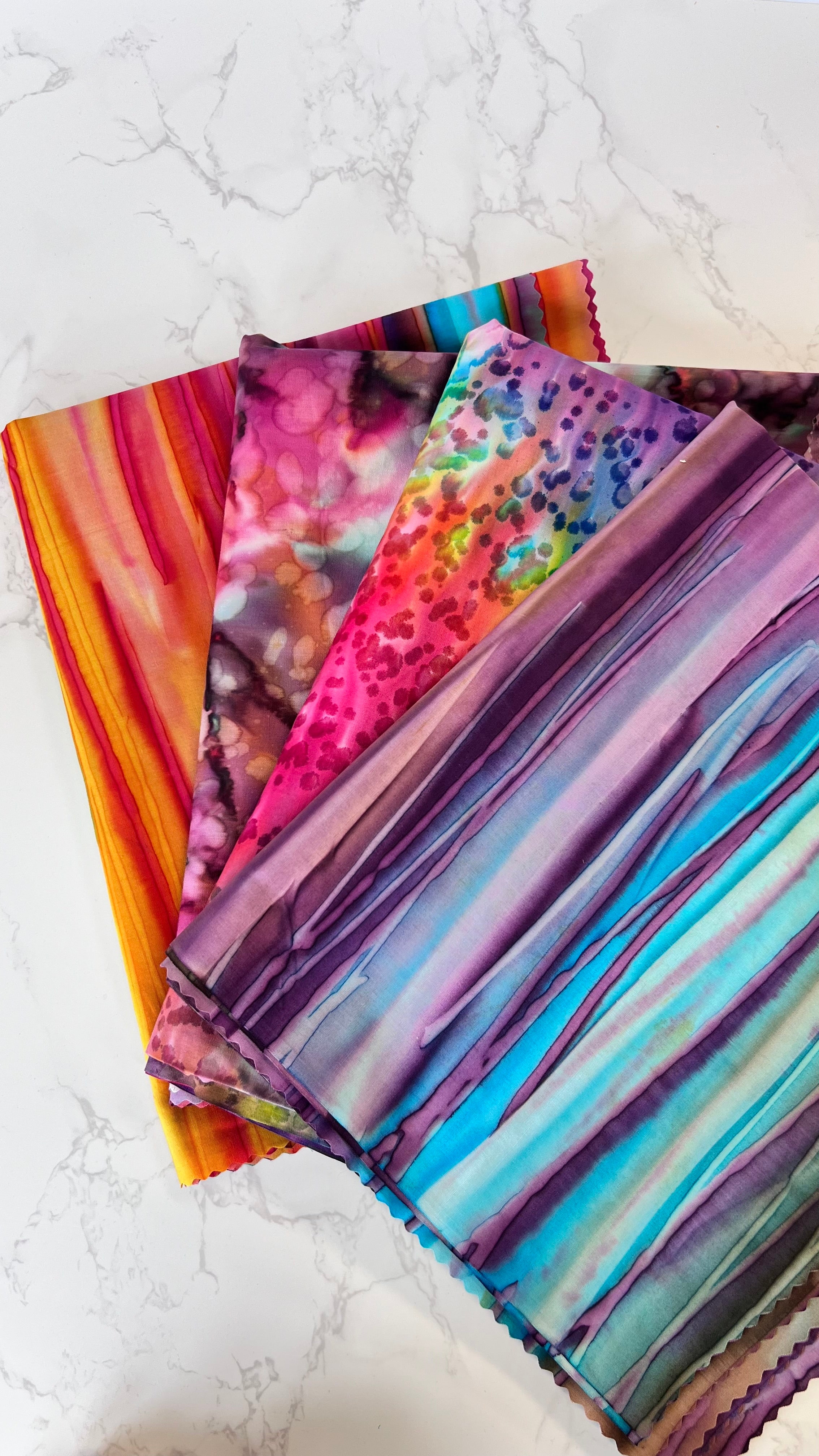 This collection features 4 fat quarters of my favorite batiks! Each piece of fabric measures 18 inches by 20-22 inches, more than enough for several projects!