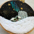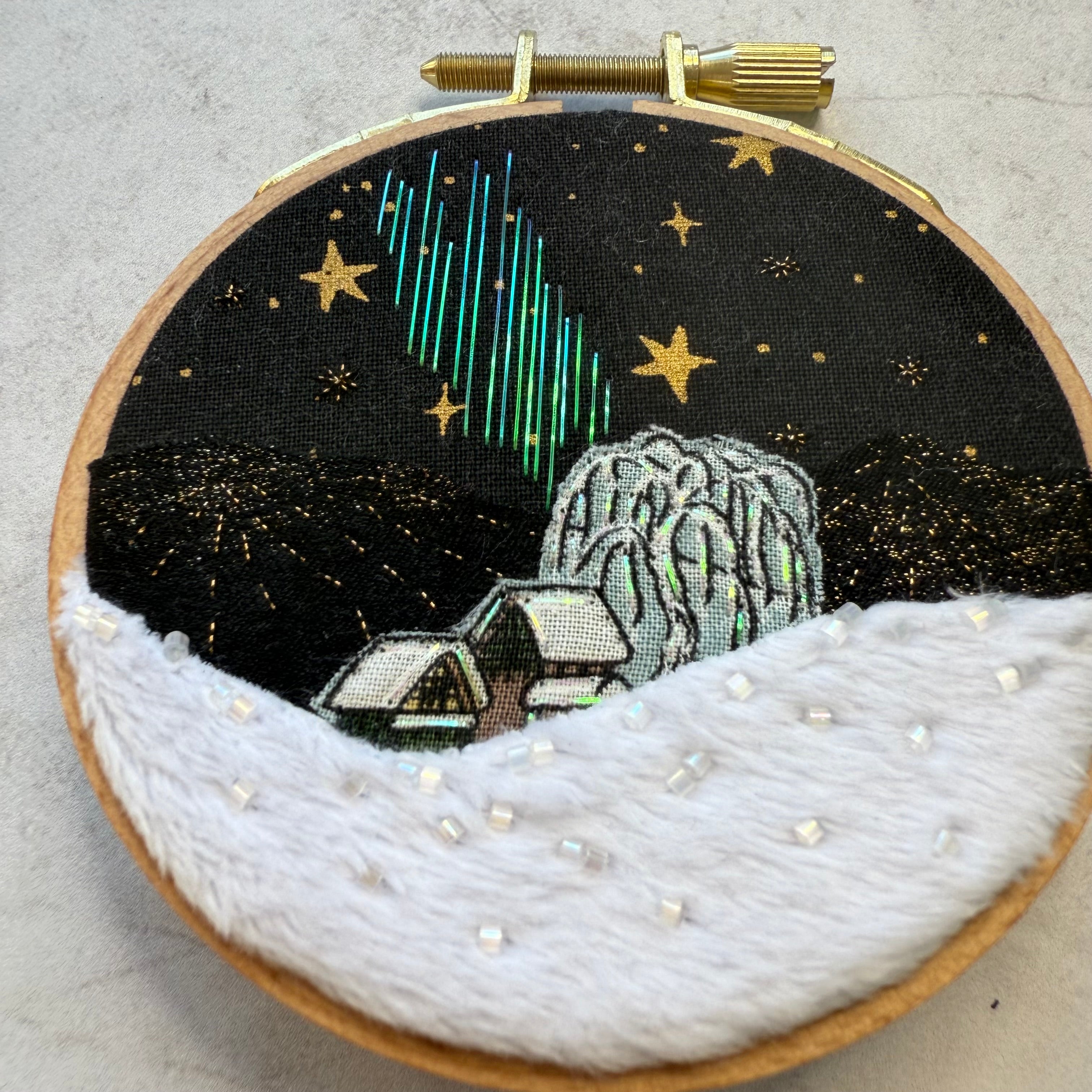 This is a handcrafted, one-of-a-kind embroidery hoop inspired by the landscapes of Oregon and the holiday season.