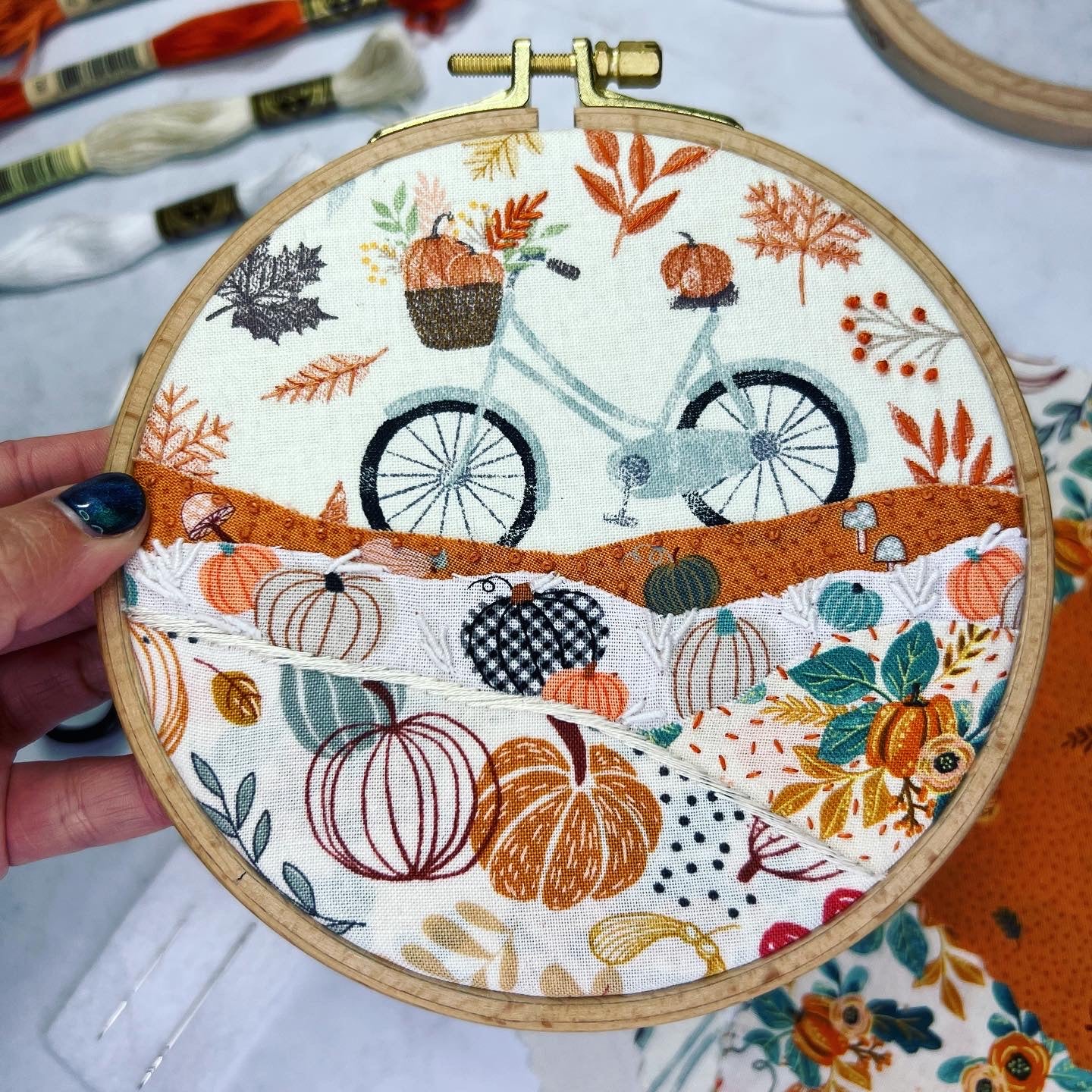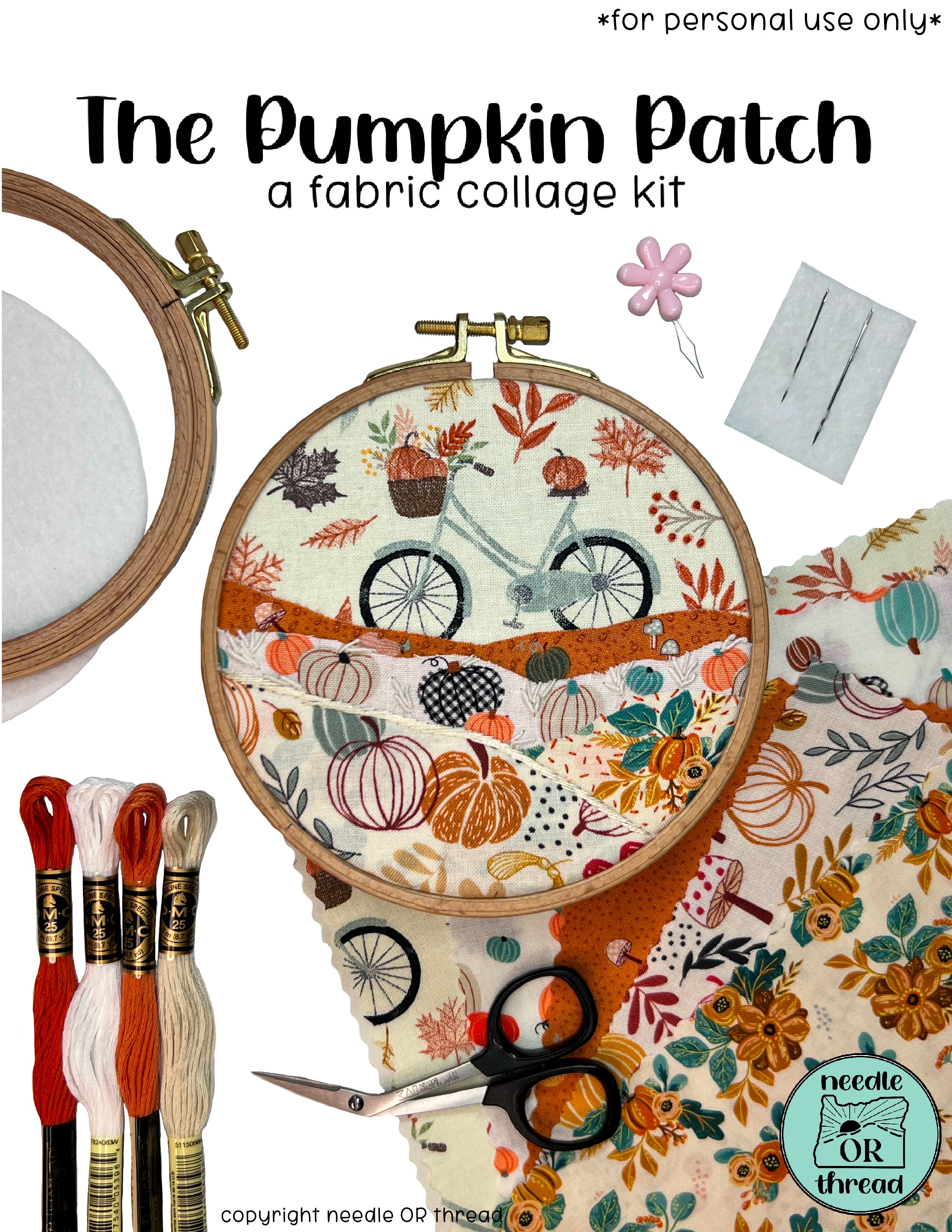 This is a beginner-friendly, fabric collage landscape embroidery kit. It includes all materials needed (EXCEPT SCISSORS) to create a fall themed landscape like the one pictured here: